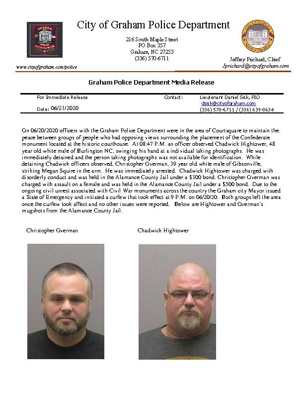 The Graham Police were in the area to maintain peace “between groups of people who had opposing views surrounding the placement of the Confederate monument,” the press release stated.