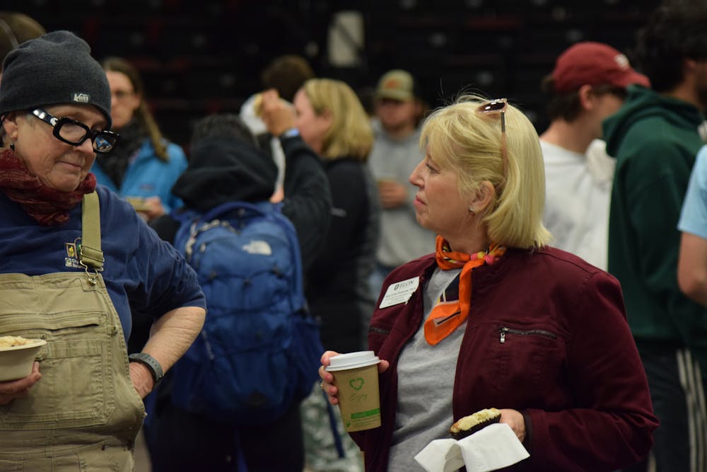 Dean of Students Jana Lynn Patterson chats with Elon University Horticulturist Susan Tripp at the College Coffee kicking off the launch of HealthEU, Elon University's student wellness initiative, in 2023.
