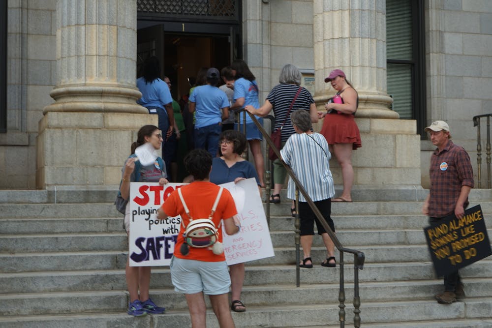 Community members walk into the Alamance County Historic Courthouse as others hold signs in protest before the County Commissioners meeting on June 16.