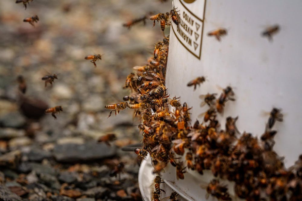 Hundreds of bees from the area gather at a neighborhood feeder filled with sugar water on Aug 4 in rural Elon. Multiple bucket feeders are scattered around the area to ensure local bees have enough food regardless of the availability of local plants.