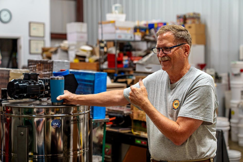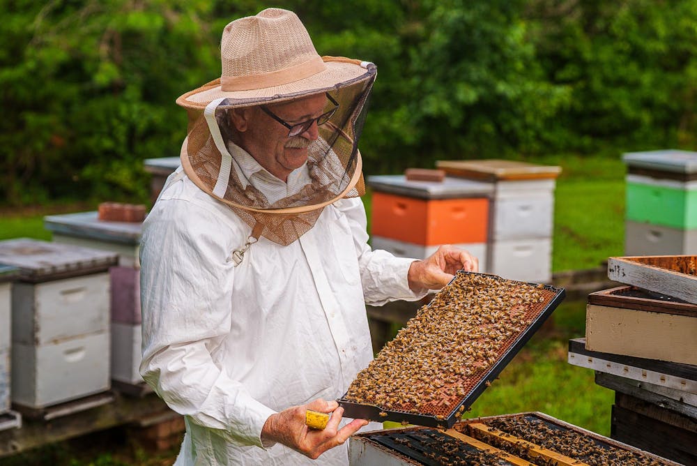 Alamance Beekeepers Club President, Ira Poston, uses a bee smoker when inspecting a hive on Aug 4 in rural Elon. Beekeepers can use smoke to calm the bees by disrupting their communication, making inspections and care much easier.