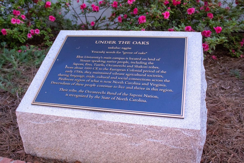 The historical marker is placed on a walking path next to Dwight C. Schar Hall, surrounded by Korean plum yew and Autumn Rouge. Engraved in gold letters, it states: “Elon University’s main campus is located on land of Siouan-speaking native people, including the Saponi, Eno, Tutelo, Occaneechi and Shakori tribes.”