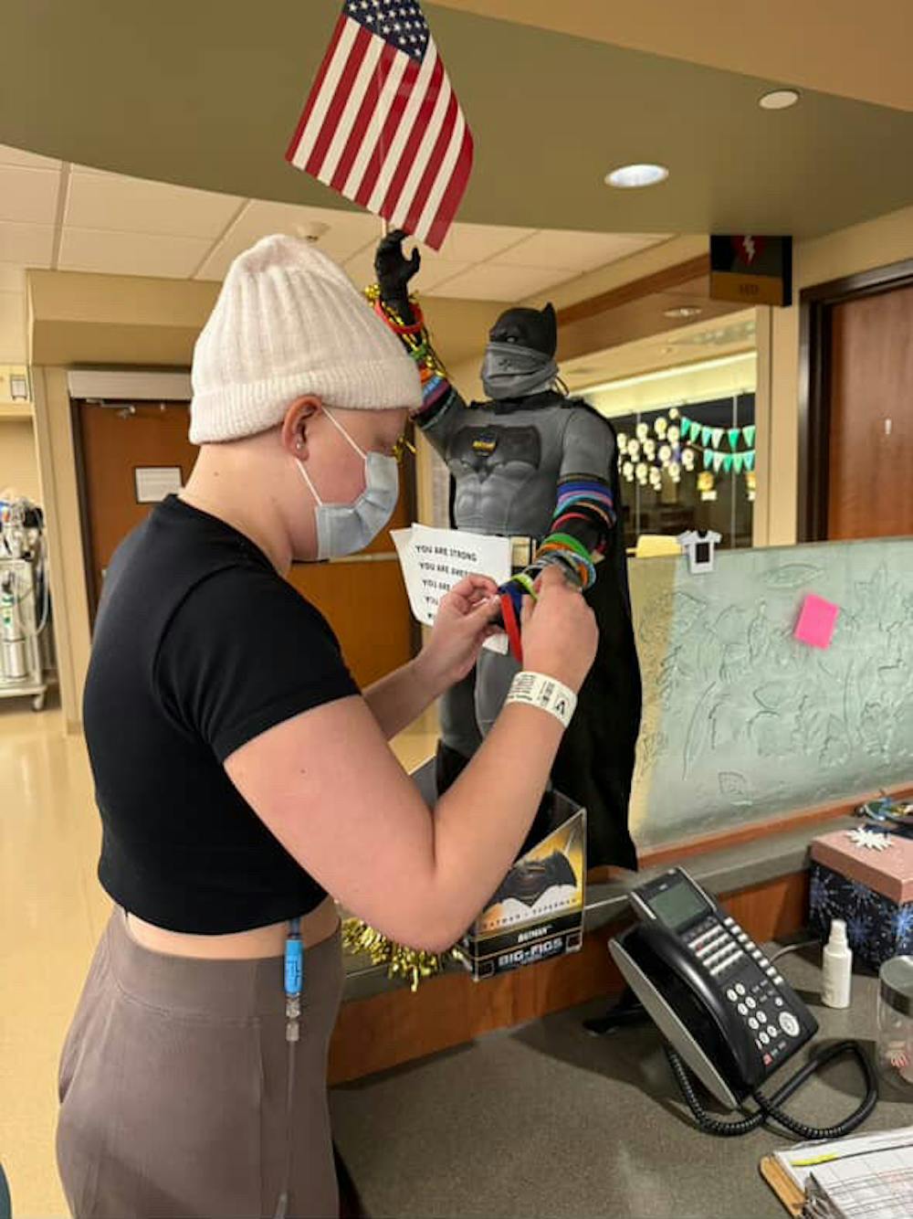 Lexi Rogers puts a “Lexi Strong” bracelet on a Batman figurine in the hospital. She said she was the youngest person in the hospital’s cancer unit when she was recieving treatment. Courtesy of Lexi Rogers.