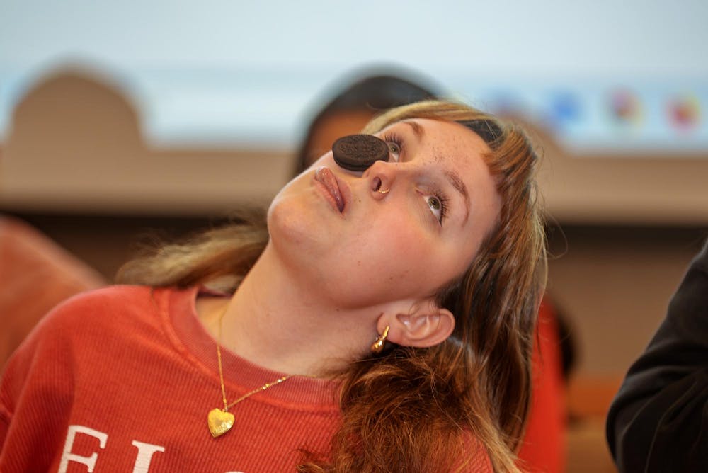 Questions ranged from Elon history to questions about campus. Challenges ranged from games of rock, paper, scissors to a challenge where the contestant is tasked with getting an Oreo from their forehead into their mouth without using their hands.