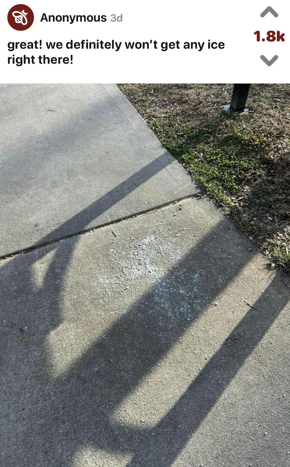 I came across a sarcastic Fizz post while I walked through the snow. It showed a concentrated clump of snow salt on the sidewalk and read, “Great! We definitely won’t get any ice here!” I saw a couple of posts like this on the student social media app.