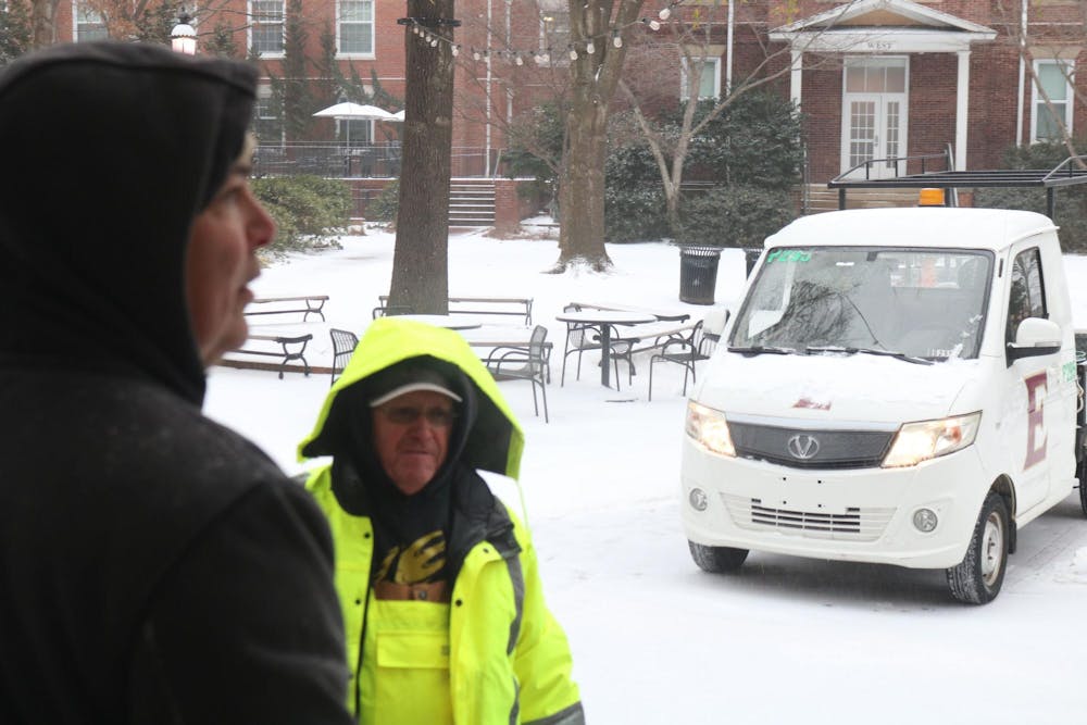 Sunday 8:11 a.m.— I can discern two men in neon workwear spreading salt beside a Cushman buggy. Snow makes anything manmade visible, distinct. It is a difficult, yet manageable, 28 degrees outside. Raymond Fletcher leaned against the pillar outside McEwen Dining Hall, waiting for me. Fletcher is the senior director of Facilities Management at Elon University.