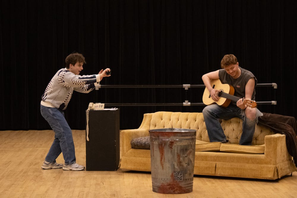 Senior Andrew France, left, who plays Mark Cohen, films sophomore Micah Cabot, who plays Roger Davis, as Cabot plays during a rehearsal for a scene from "Rent" Jan. 21 in Scott Studios.