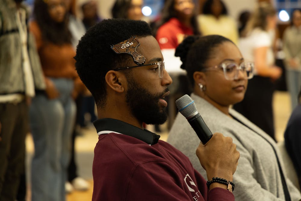 Elijah Pegues answers a question asked during one of the opening speeches at the Black Table Talk in McBride Gathering Space on Feb. 11