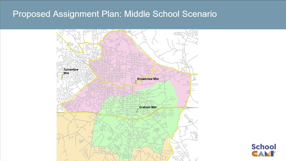 The approved rezoning map for the Alamance-Burlington School System middle schools. Courtesy of SchoolCAMP.