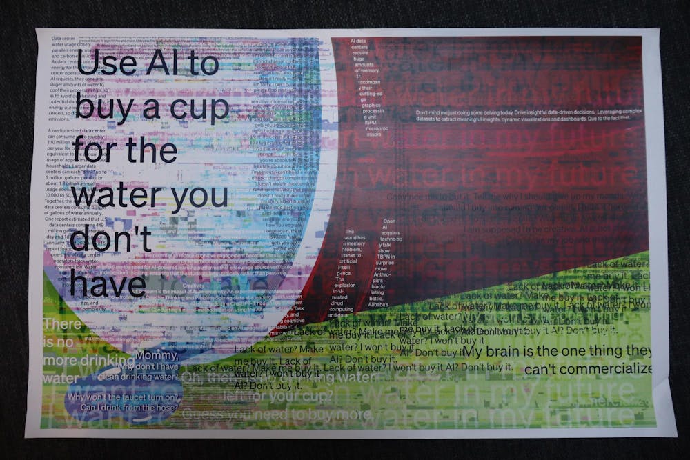 Wakelin’s poster was covered in layers of text, much of which was pulled from scholarly and news sources and relating to these ethical and environmental concerns of AI usage.