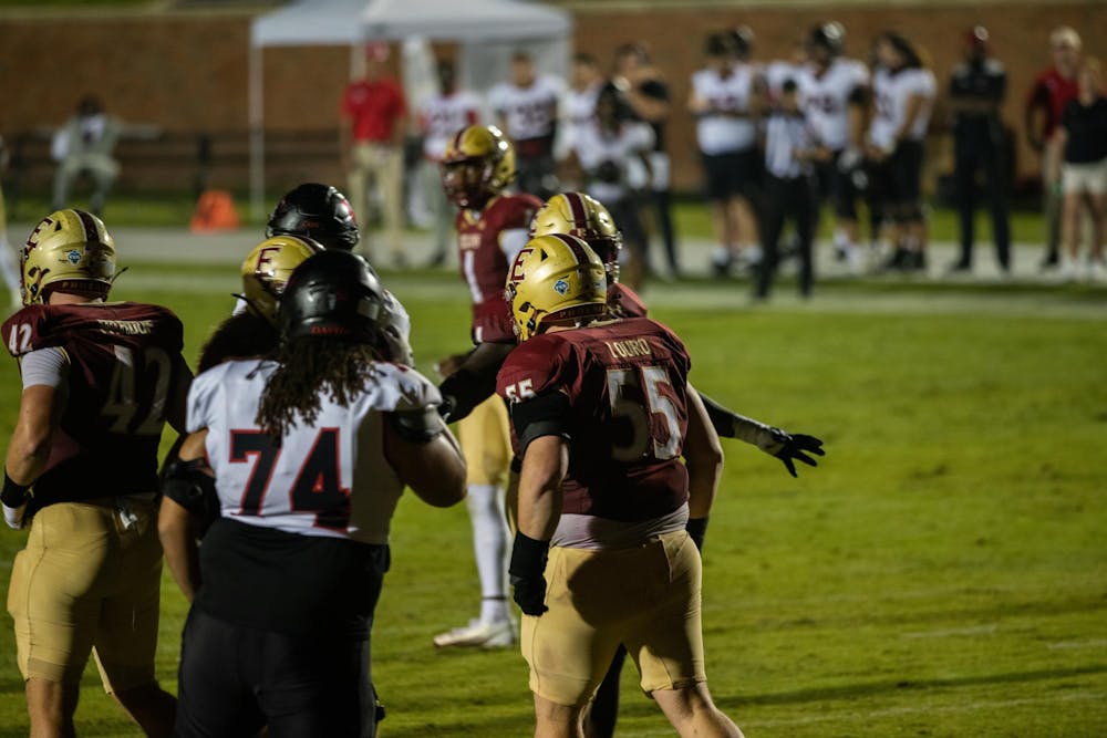 Jake Louro celebrates with teammates with Elon currently in control against Davidson