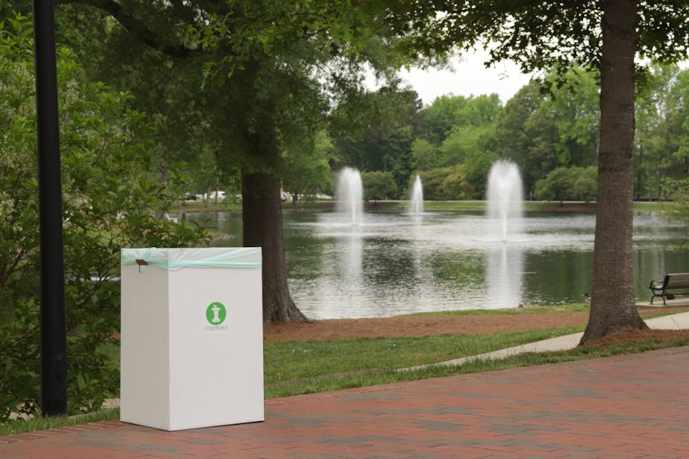 A temporary recycling bin on the path beside Lake Mary Nell at Earth Fest 2025. Many permanent recycling bins have bin removed from Elon University recently because of contamination by non-compostable waste.