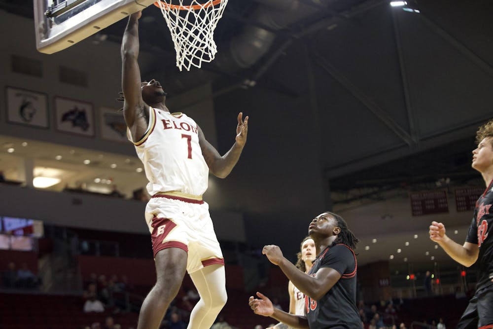 Graduate student Chandler Cuthrell attempts a lay up on Nov. 5 against Belmont Abbey. Cuthrell scored 22 points, the most out of all the Elon players this game.