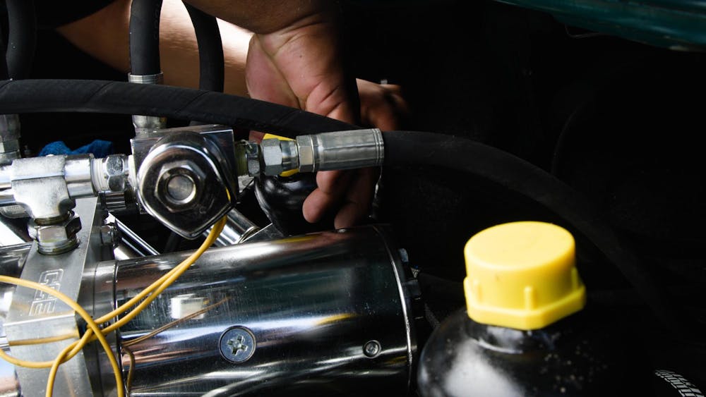 A lowrider is working on their car after a hydraulic malfunction. Un lowrider está trabajando en su carro después de un fallo hidráulico.