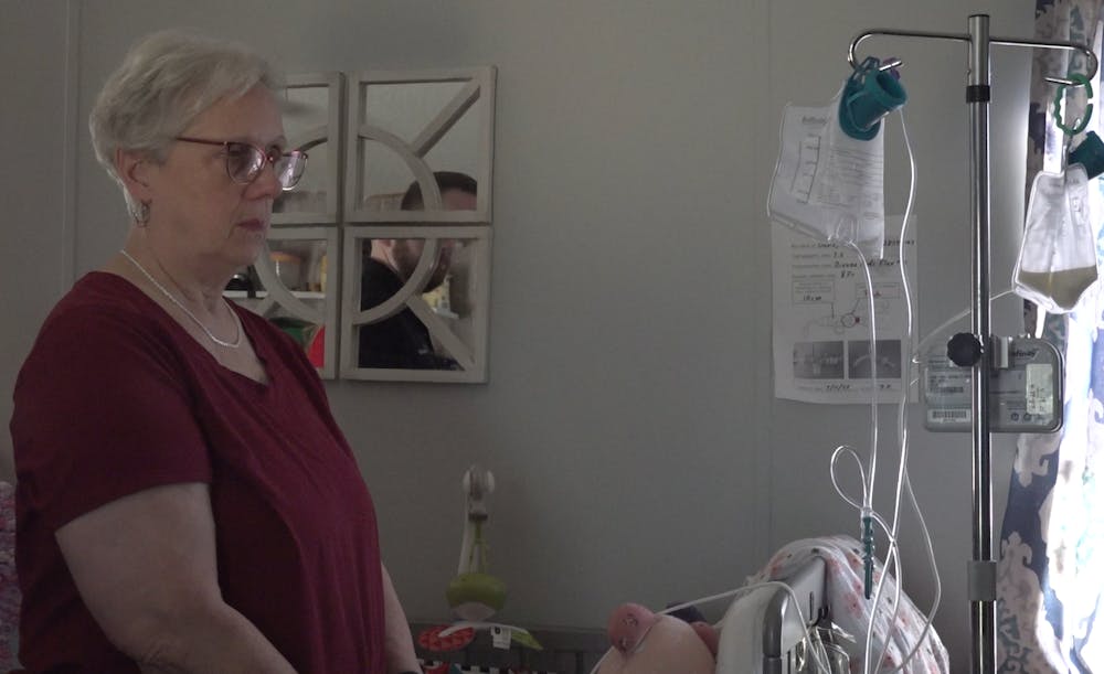Harper Davis's in-home Nancy Haplin stands at Harper's crib. She has been with the family since Harper first came home.