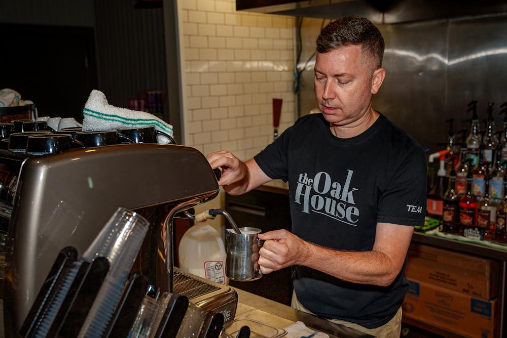 The Oak House proprietor, Phil Smith, steams milk into a pitcher to make a French vanilla latte on Aug 13 in The Oak House.