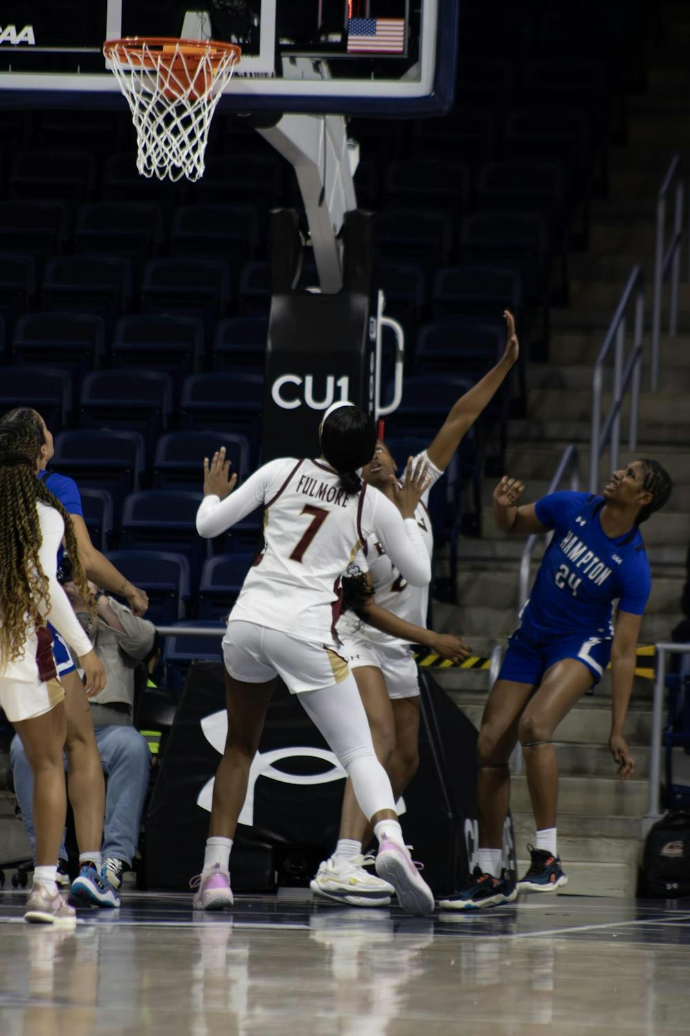 Quinzia Fulmore goes for a rebound in round two of the 2026 CAA women's basketball tournament.