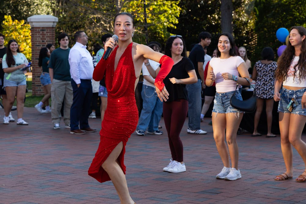 PeiWei Cobo leads attendees in a salsa dance lesson during the Hispanic Heritage Month Kickoff on Sep 19 at Medallion Plaza.