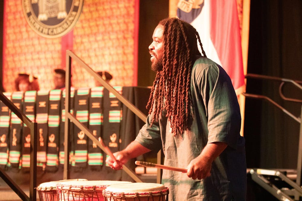 A drummer plays during the dance of celebration that kicked off the Donning of the Kente ceremony May 22 at Alumni Gym.