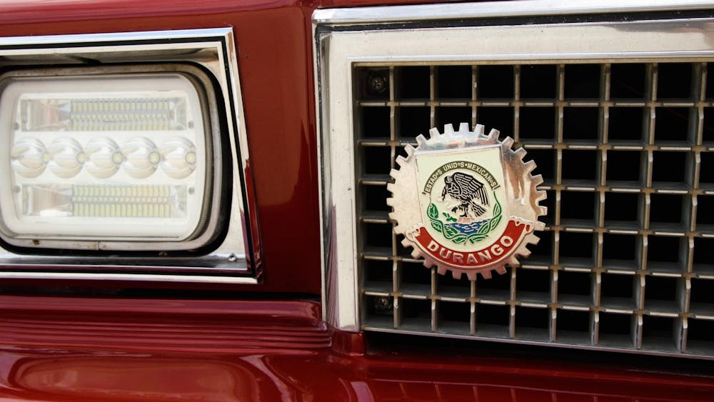 On one of the lowriding cars is an emblem paying homage to Durango Mexica. En uno de los autos lowriding hay un emblema que rinde homenaje a Durango, México.