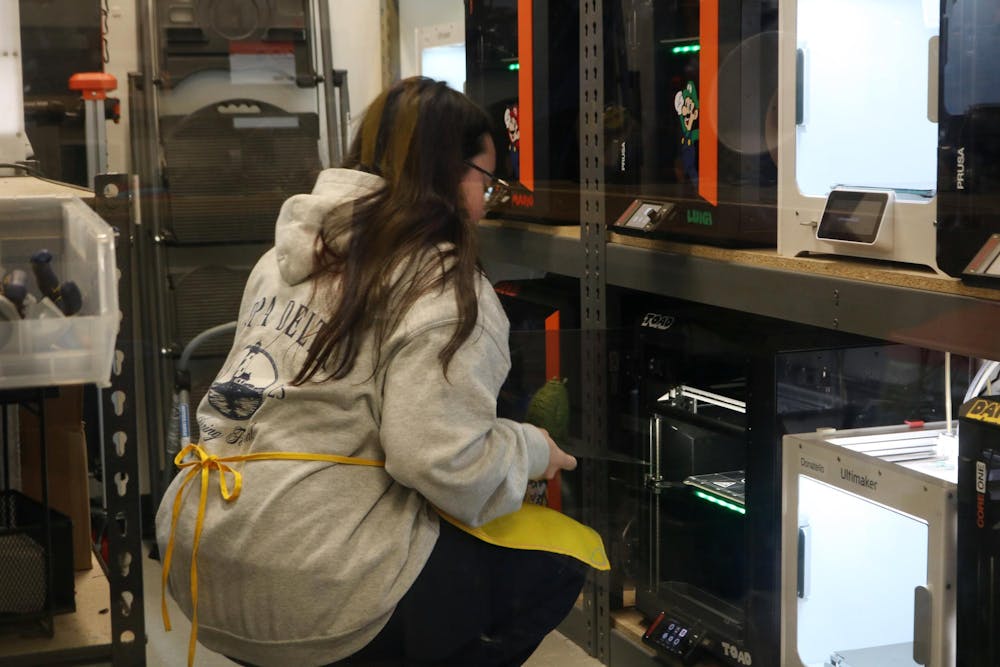 Downtown Maker Hub employee junior Olivia Jordan takes a completed Totoro figure out of one of the Hub's 3D printers.