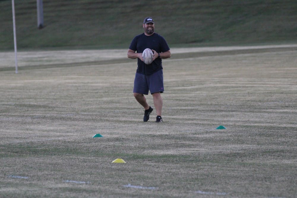 Elon Men's Rugby Coach Ryan Bays takes the team through drills during a practice. Bays has coached the team since 2003