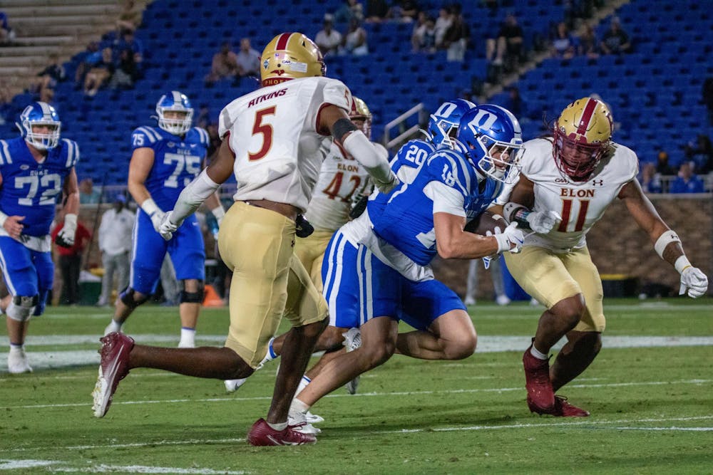 Elon defenders swarm a Duke wide receiver and attempt to tackle him during Elon's season opener against Duke on Aug. 28.
