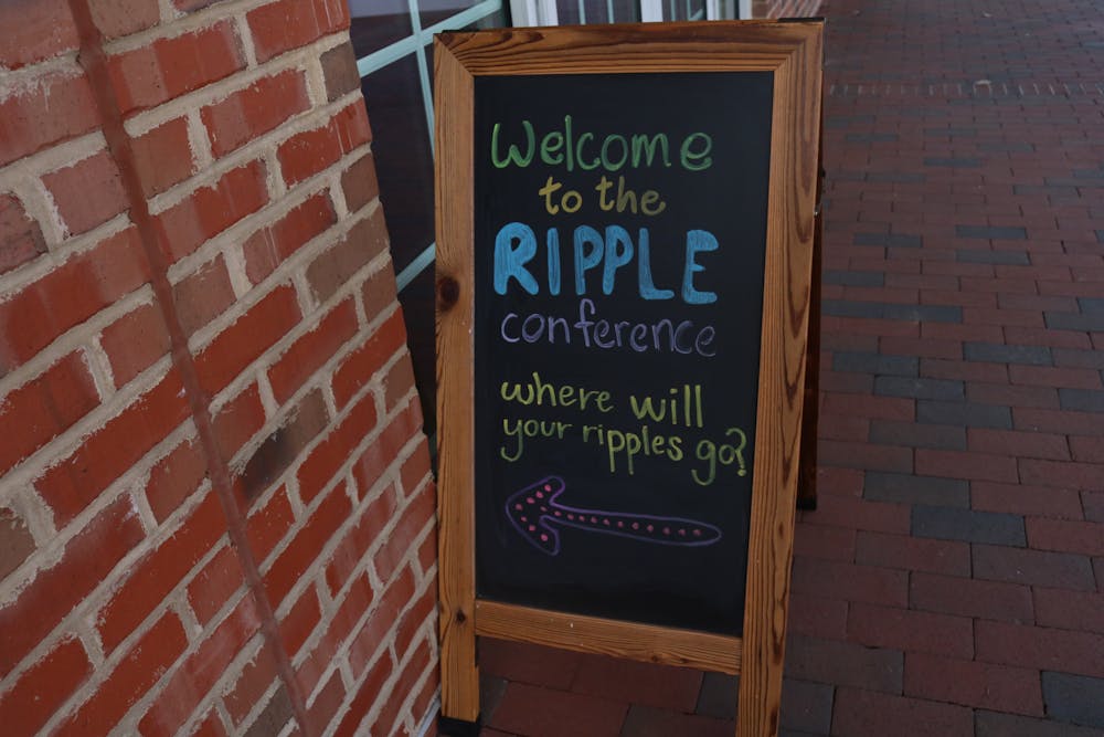 A chalkboard sign outside of the Numen Lumen Pavilion welcomes participants to the Ripple Conference on Feb. 22.