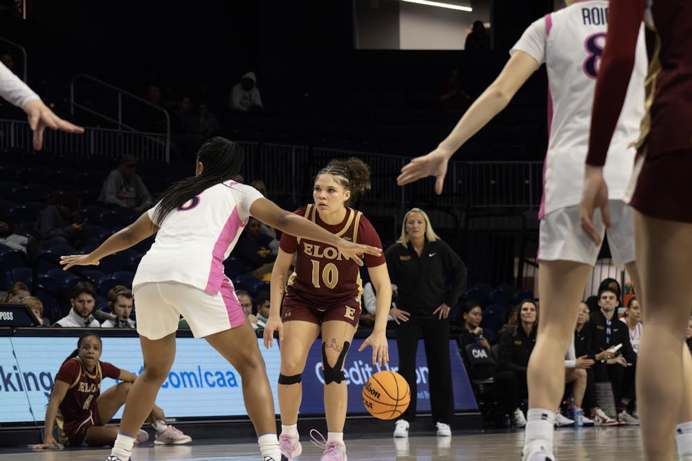 Senior Kamryn Doty dribbles to the paint in Elon's quarterfinal game against Drexel University.