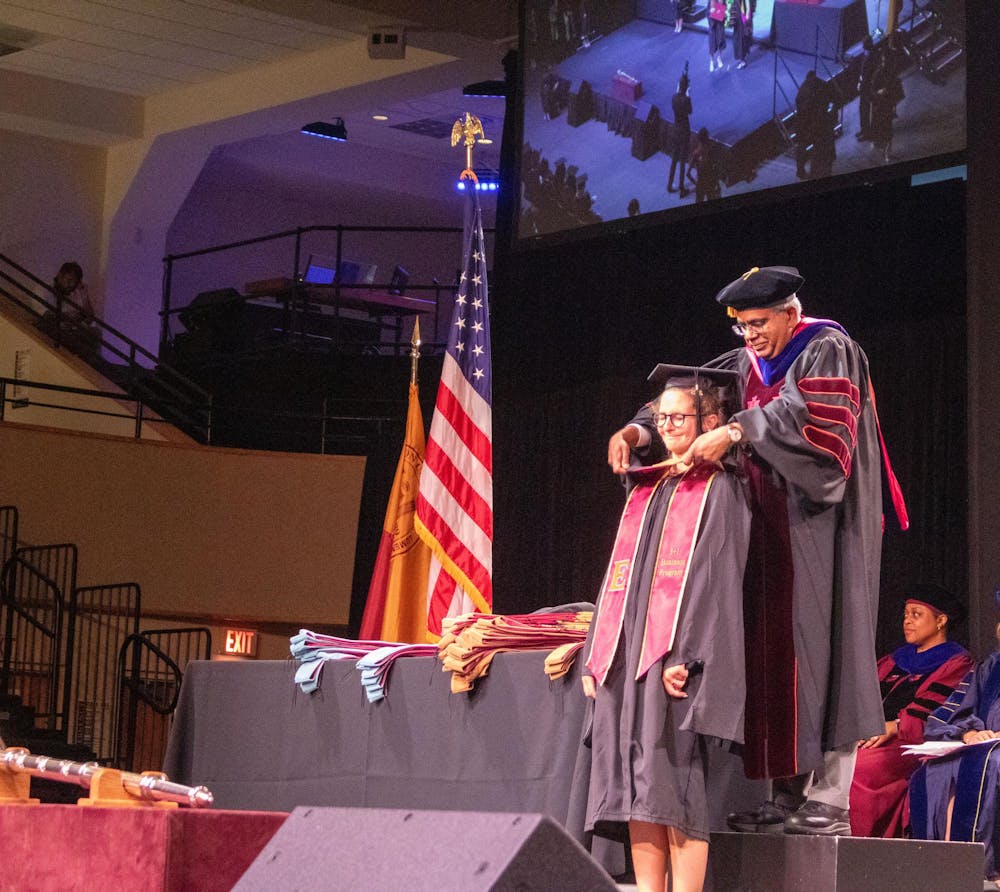 A hood is bestowed upon an Elon University graduate student during the commencement ceremony on May 21 at Alumni Gym.