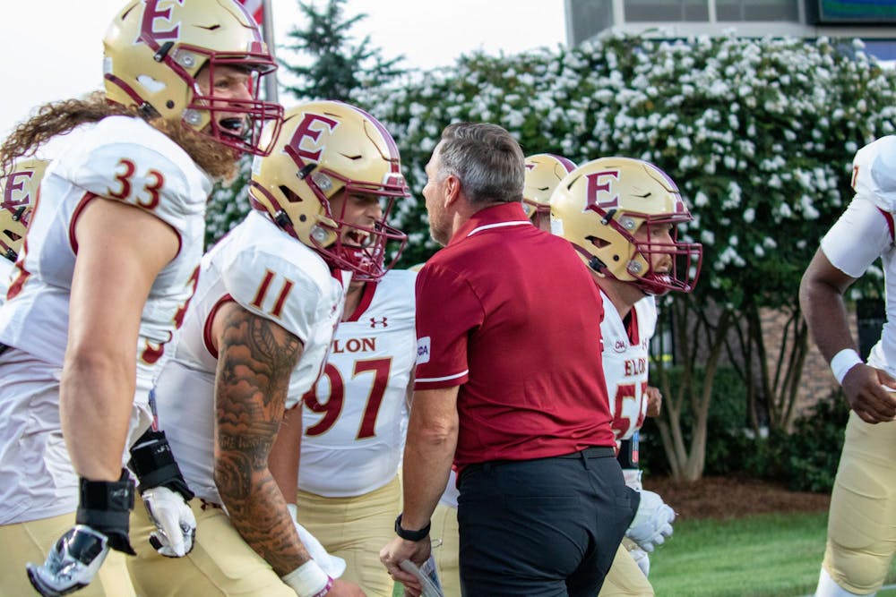 The Elon University football team run past head coach Tony Trisciani onto the field before their season opener on Aug. 28.