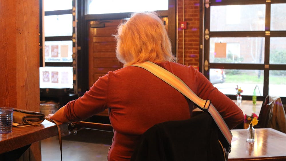 Crystal Burroughs tunes her guitar as she prepares to perform at Speakeasy Carrboro's open mic night March 11.