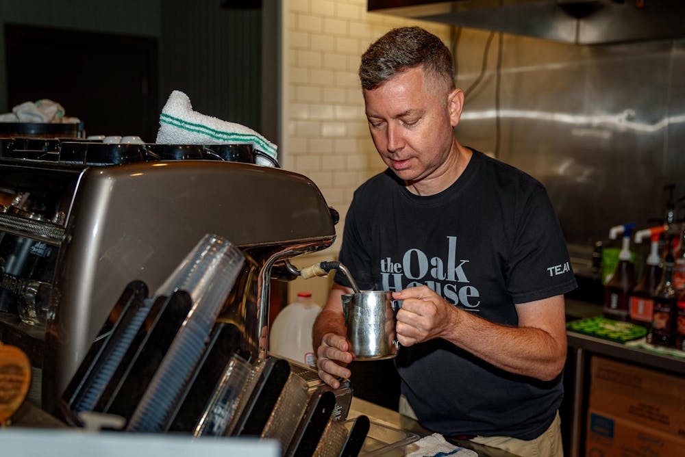 The Oak House proprietor, Phil Smith, steams milk into a pitcher to make a French vanilla latte on Aug 13 in The Oak House.