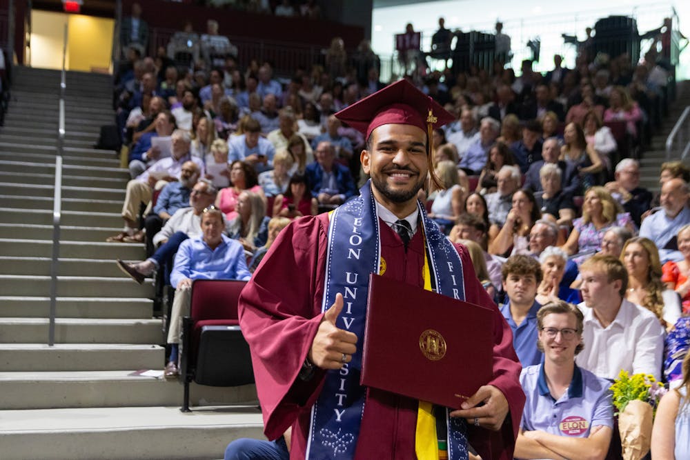 Chase Augustus gives a thumbs up while holding his diploma during the commencement ceremony on May 23 at Schar Center.