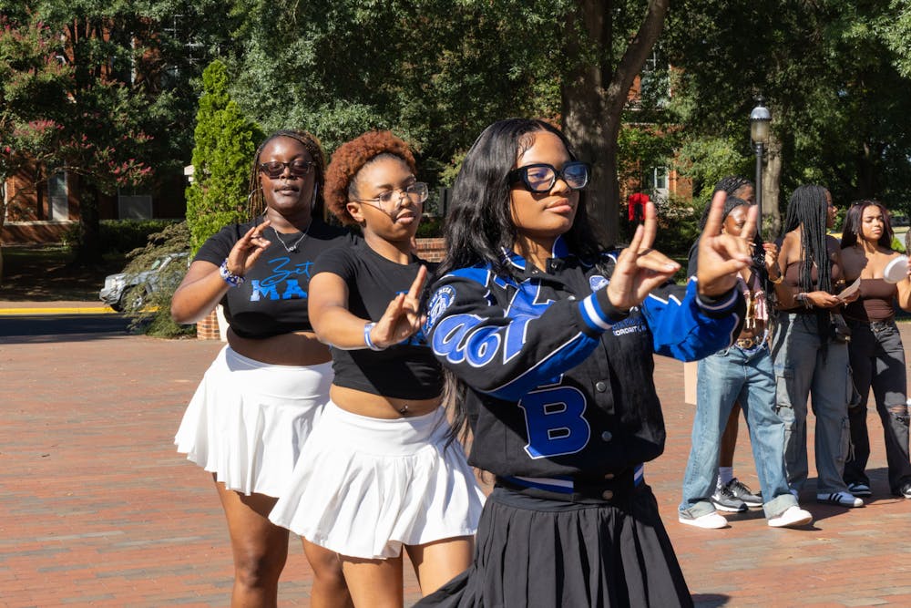 Members of Zeta Phi Beta Sorority, Inc. performing a stroll during the Welcome B(l)ack Cookout Aug. 30 at Phi Beta Commons.