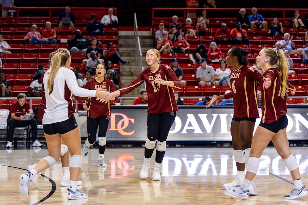 The Elon University Volleyball team celebrates after a point against Davidson College on Sep. 5