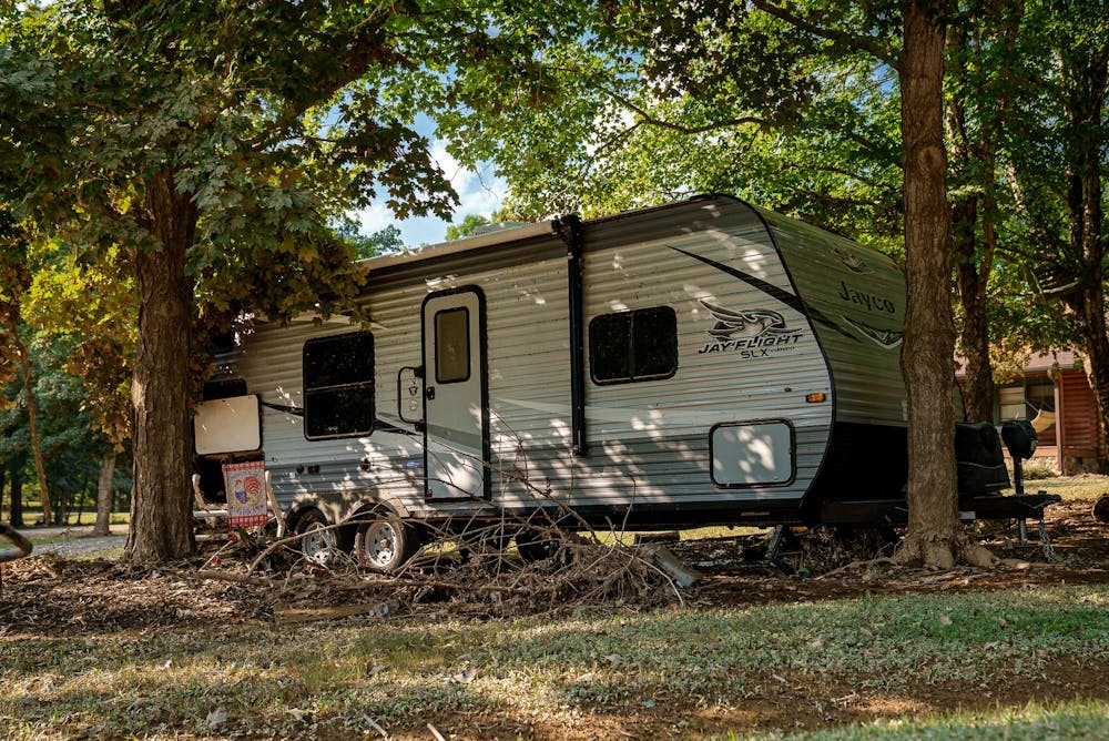 A camper trailer is surrounded by debris and mud after heavy rain on July 7 in Mebane, North Carolina.