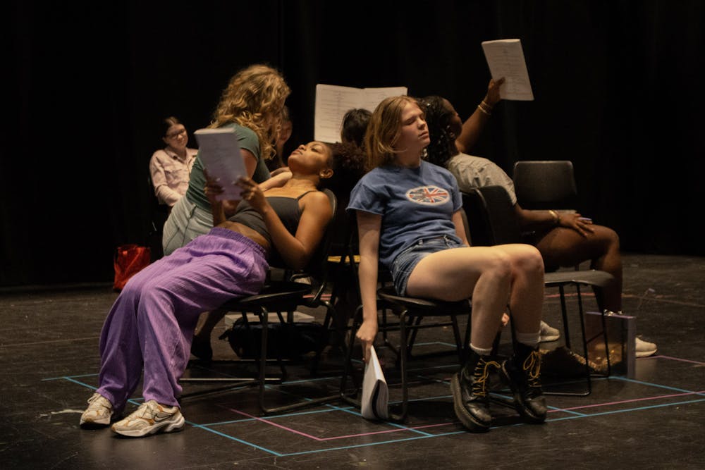 “Sororophobia” cast members rehearse the Act I demon summoning scene March 30 in the Center for the Arts Black Box Theatre. The staging of this scene changed throughout the rehearsal process. In the final production, the actors are facing in the circle and reading from a "spell book" that they pass around.