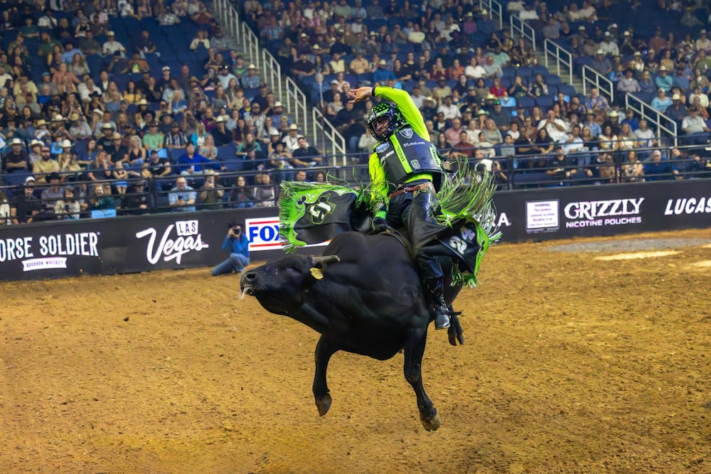 Austin Gamblers rider Sage Kimley rides a bull, but fails to make the eight seconds at PBR’s Carolina Cowboy Days on Sept. 12. Kimzey has won seven PBR world championships since 2015. His Sept. 12 ride on “Demonic” scored 83.25, but the Gamblers lost to the Ridge Riders 347-257.