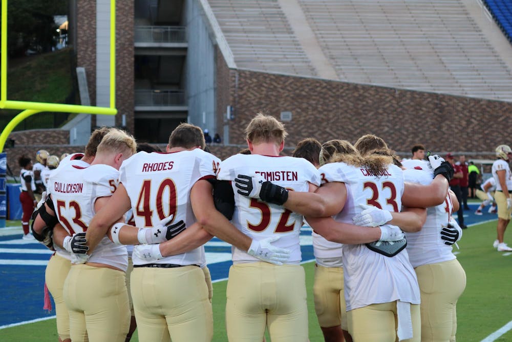 Members of the Elon football team huddle together before their season opener on Aug. 28.