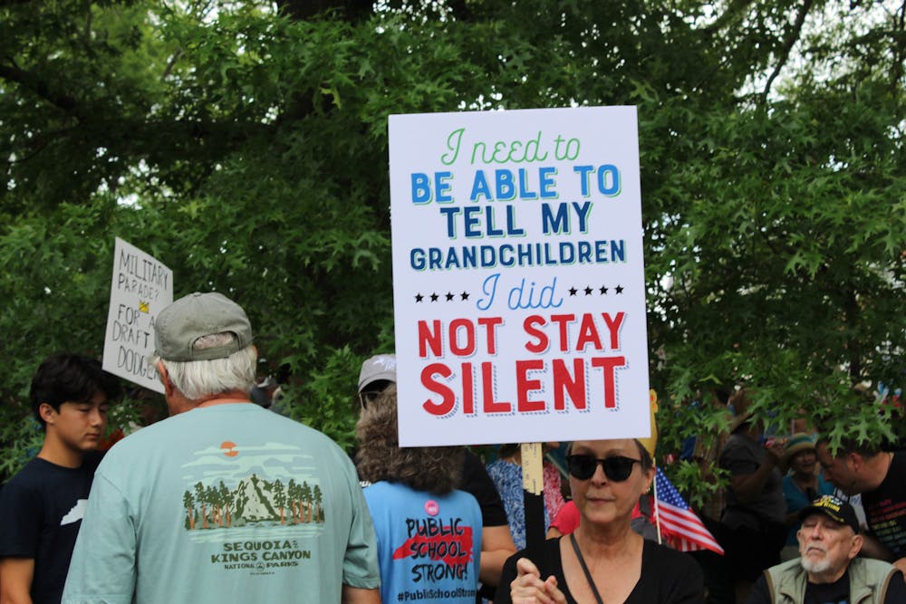 A women holds a sign during the No Kings protest on June 14 in Hillsborough