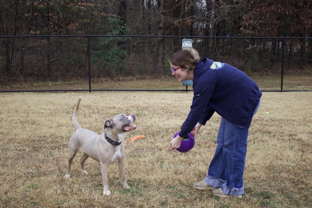 Amanda Lucas, animal care staff at Burlington Animal Services, plays with London, a shelter dog, on Jan. 10.