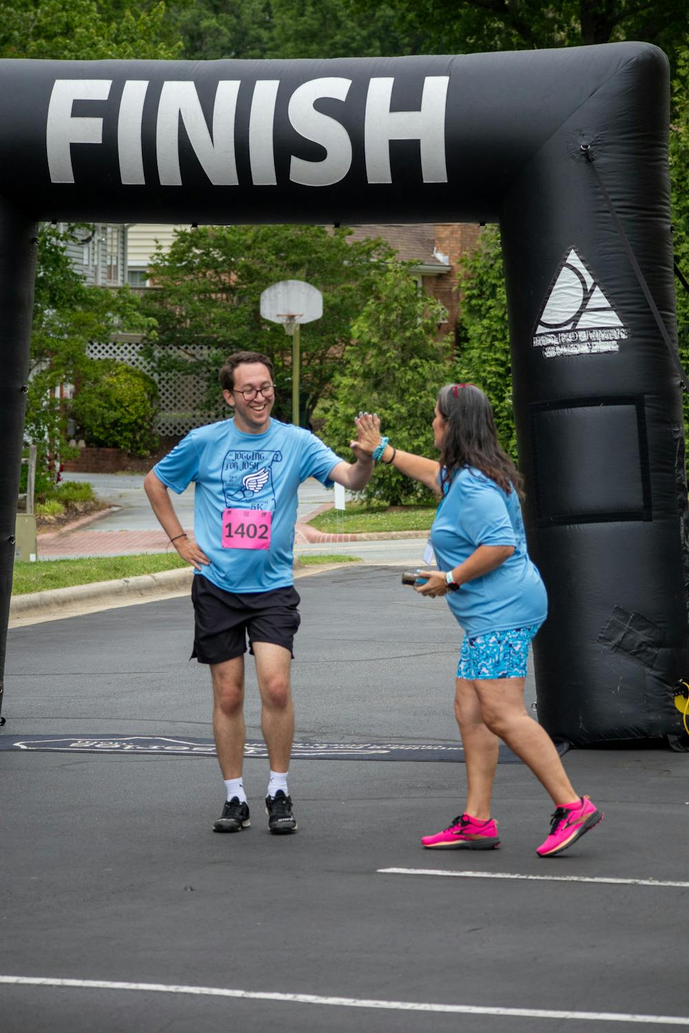 Juanita Hughes high-fives Jonathan Blackwell as he crosses the finish line during the Jogging for Josh 5K on May 3.