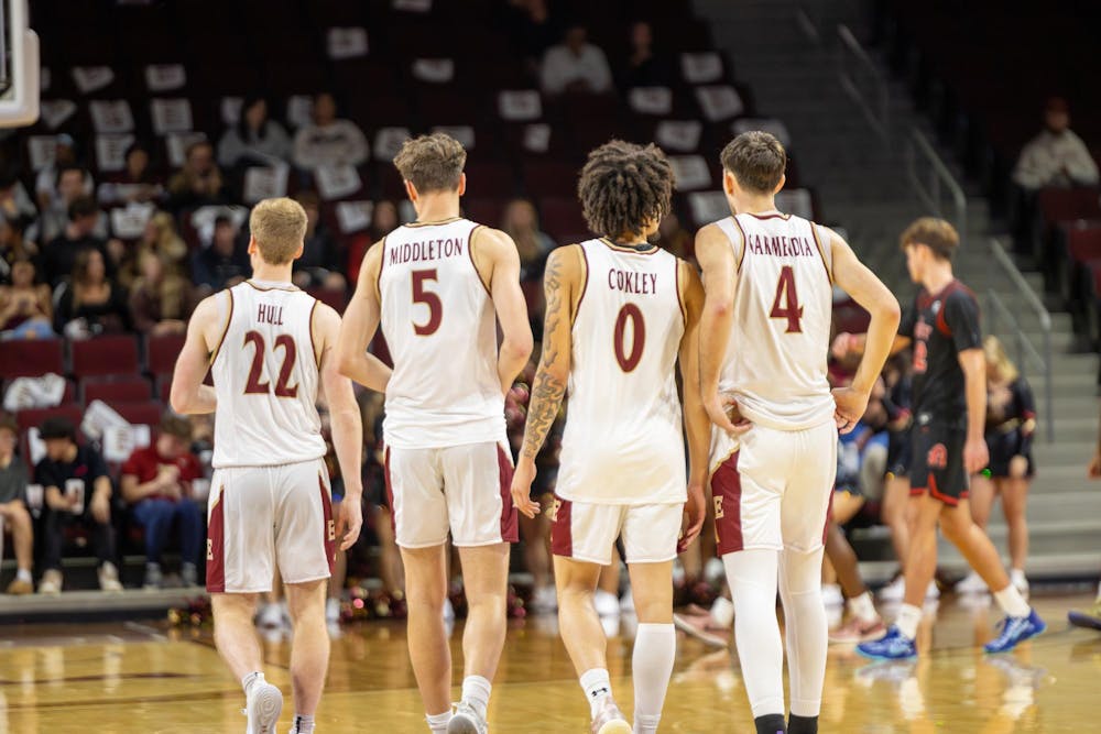 (From left to right) Redshirt sophomore Ned Hull, sophomore Caleb Middleton, sophomore Bryson Cokley and redshirt freshman Iker Garmendia walk over for a time out during the Belmont Abbey game on Nov. 5.