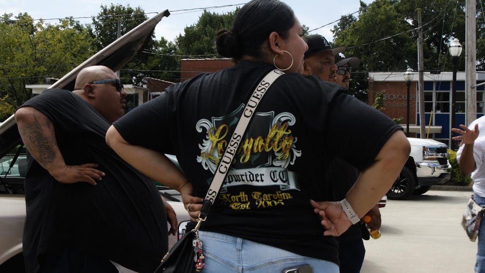 Members of Lowyalty Car club gather at a community event and talk amongst eachother. Los miembros del club Lowyalty Car se reúnen en un evento comunitario y conversan entre ellos.