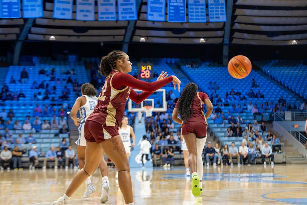 Redshirt Junior Tyana Walker passes the ball over to her teammate in a game against University of North Carolina Chapel Hill on Nov. 6.