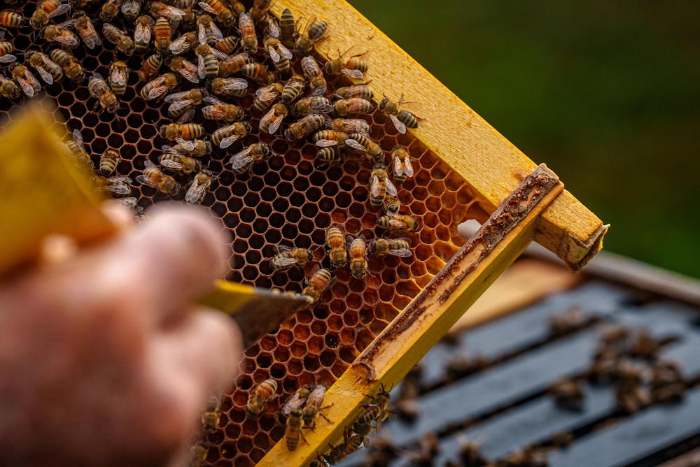 Alamance Beekeepers Club President, Ira Poston, points out the different areas of a frame that bees use to store honey, pollen, or foster larvae.
