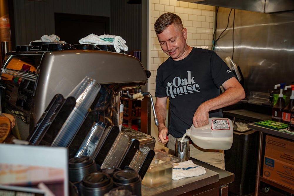 The Oak House proprietor, Phil Smith, pours milk into a steaming pitcher to make a French vanilla latte on Aug 13 in The Oak House.