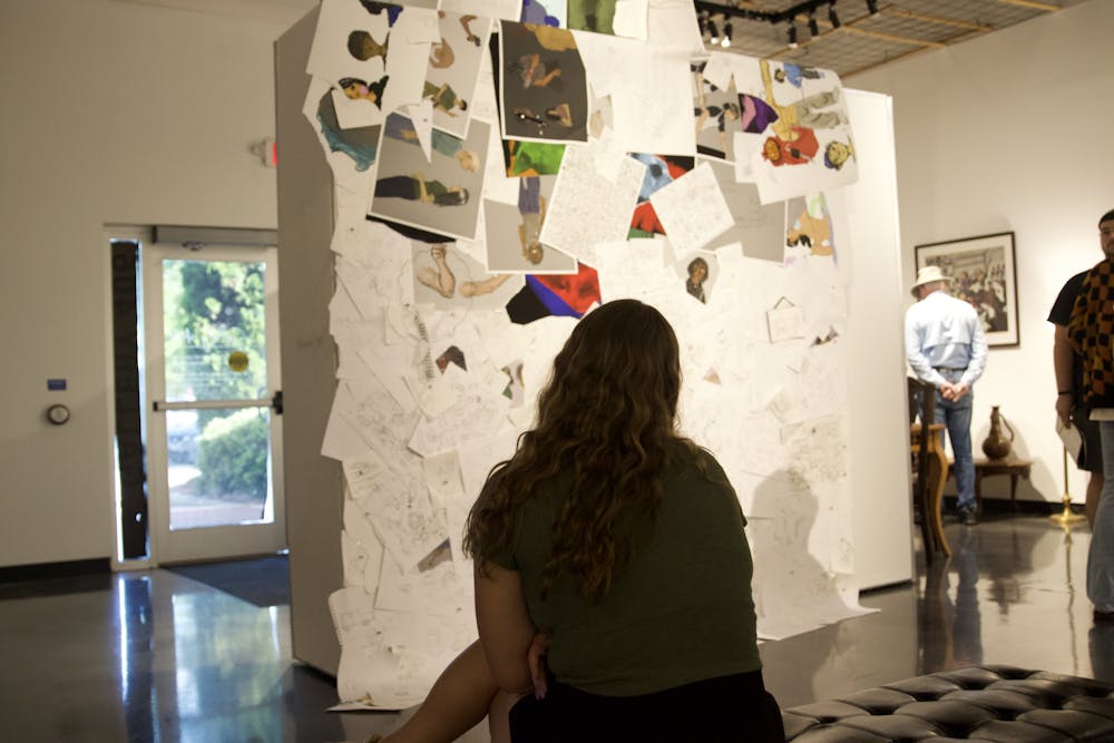A spectator looks at James Eaton's senior thesis. The Senior Thesis Exhibition called Breaking the Frame showcased six senior's projects on May 9.