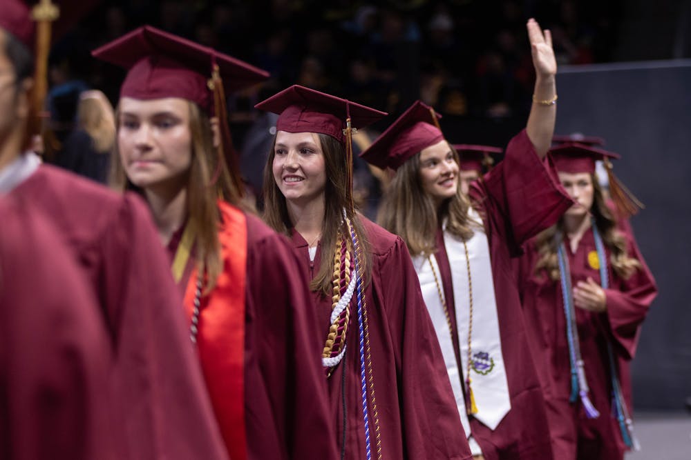 Graduating seniors line up to walk the stage at the Elon University 135th Undergraduate Commencement May 23 at Schar Center.